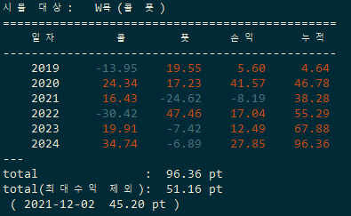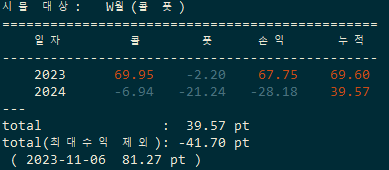 우선 옵션 전체에 대한 연간 수익 표입니다. 23/11/06일에 발생한 최대 수익일을 제외하니 -53 pt 정도입니다.