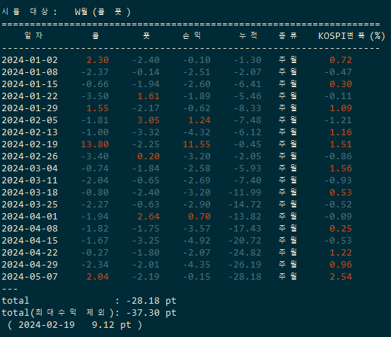 Weekly옵션(월) 만기일 결과입니다. 시행한 2023년에는 큰 수익이 났었군요. 반면에 올해는 손실입니다.